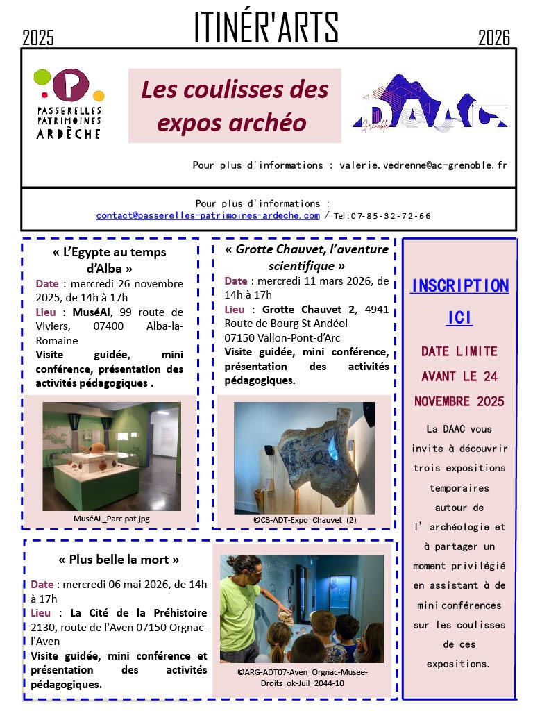 - Mercredi 26 novembre 2025 de 14h à 17h avec l'exposition "L'Égypte au temps d'Alba" au MuséAl d'Alba-la-romaine